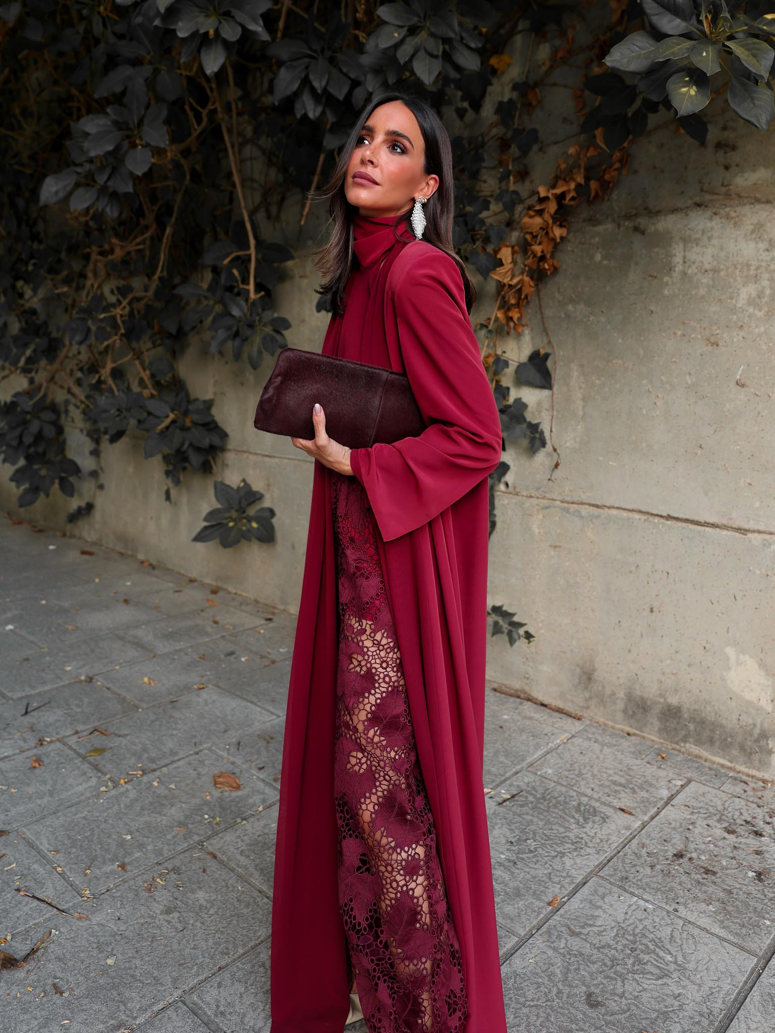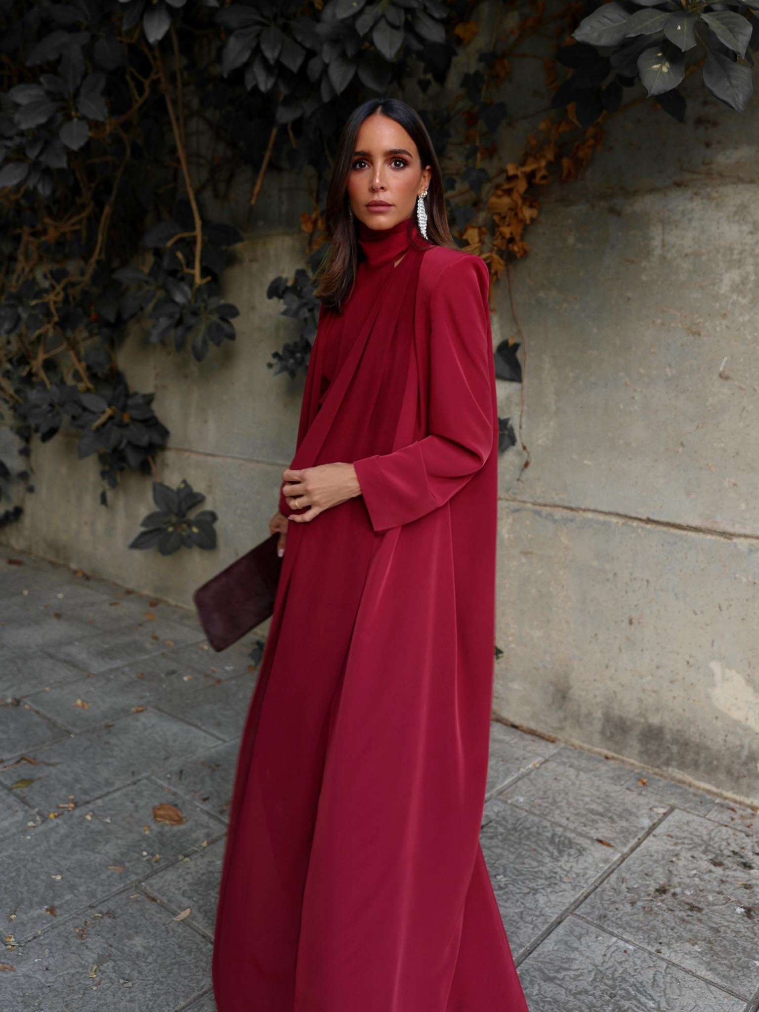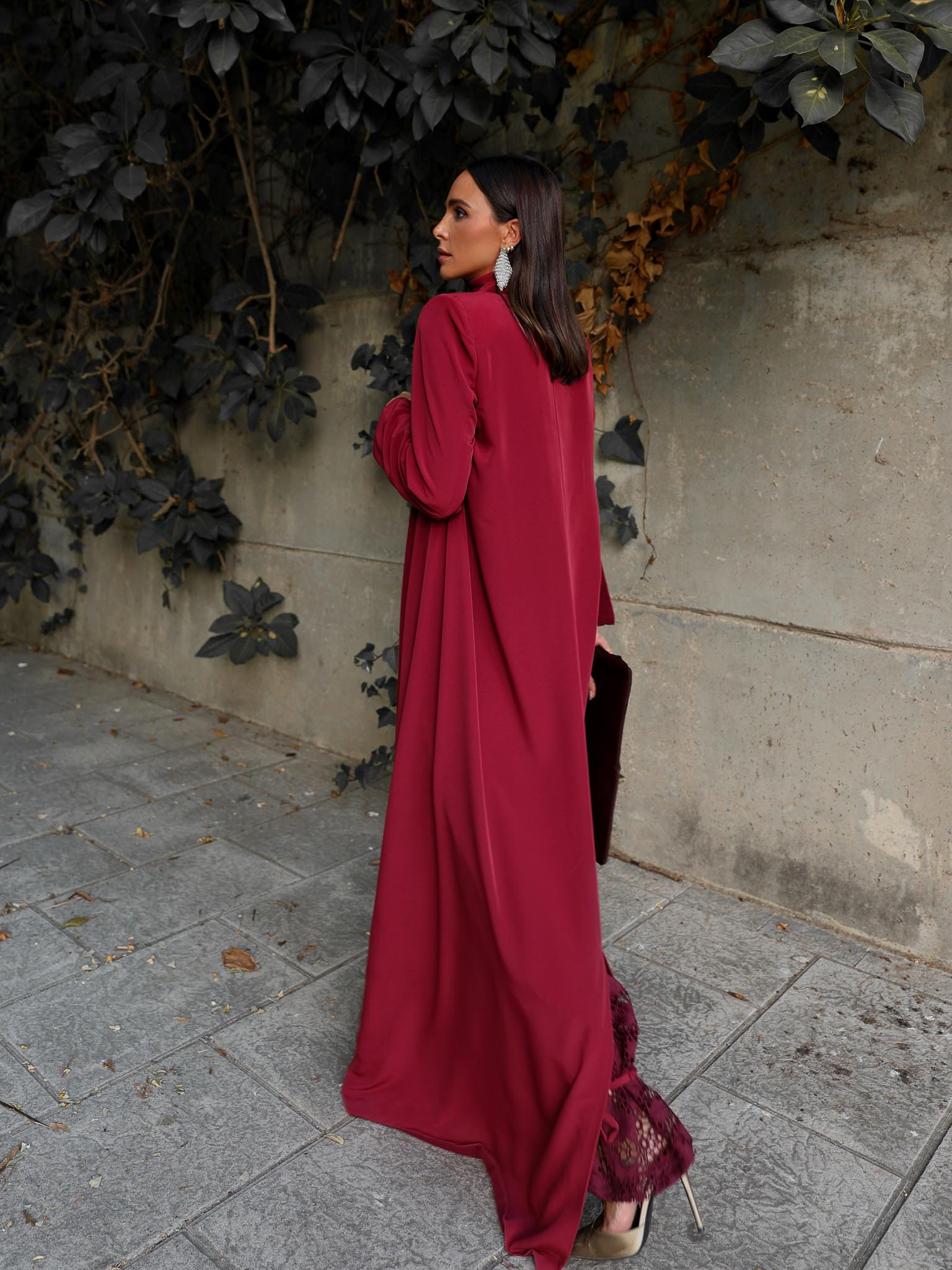 Chaqueta larga fluida confeccionada en tejido de crepé adornada con vistas de gasa al tono. Manga larga y hombreras incorporadas.