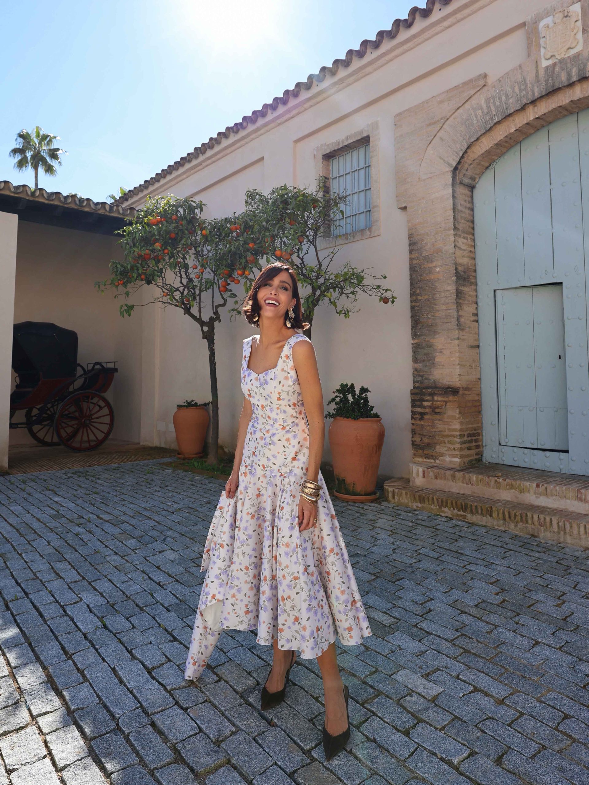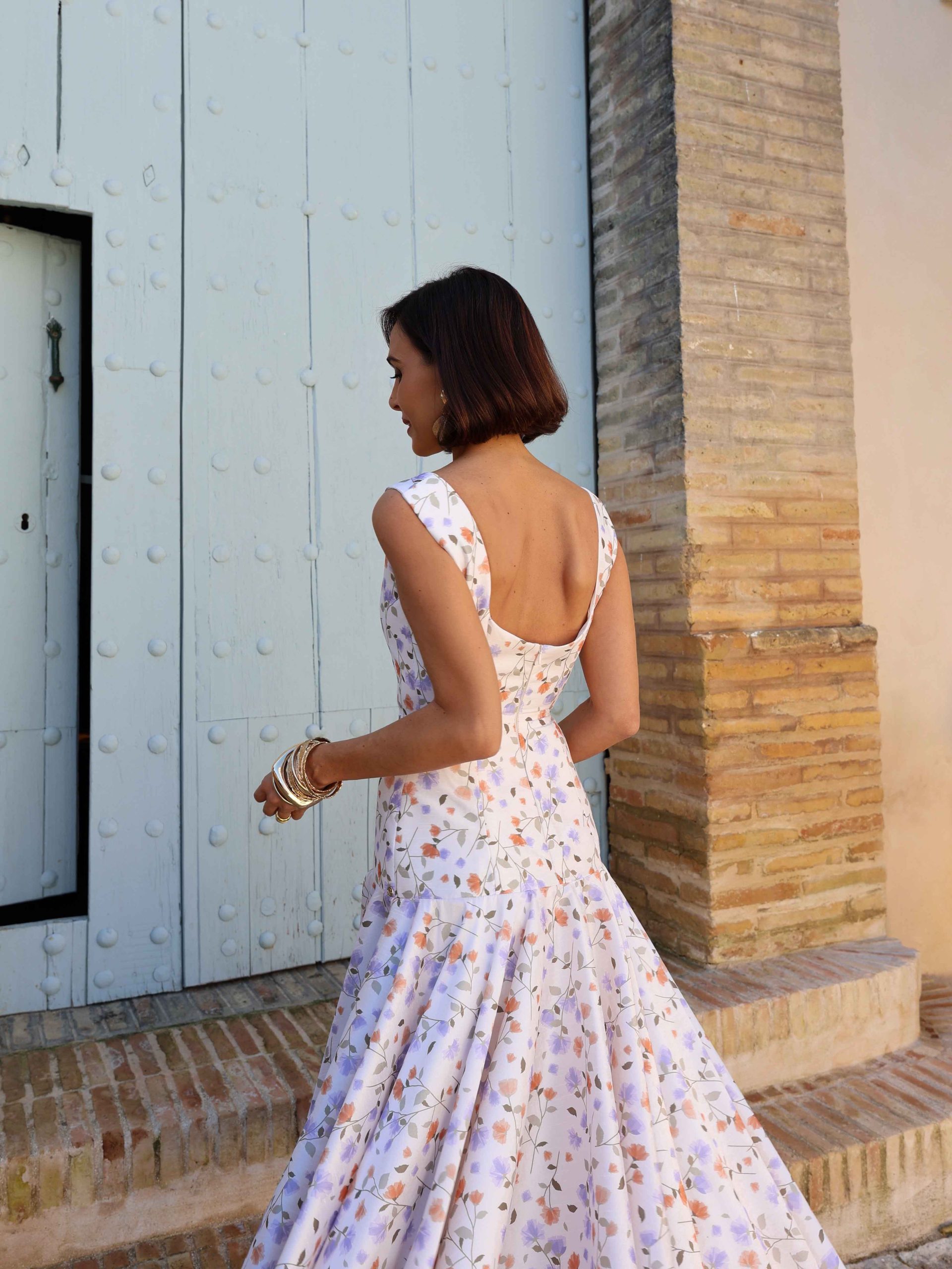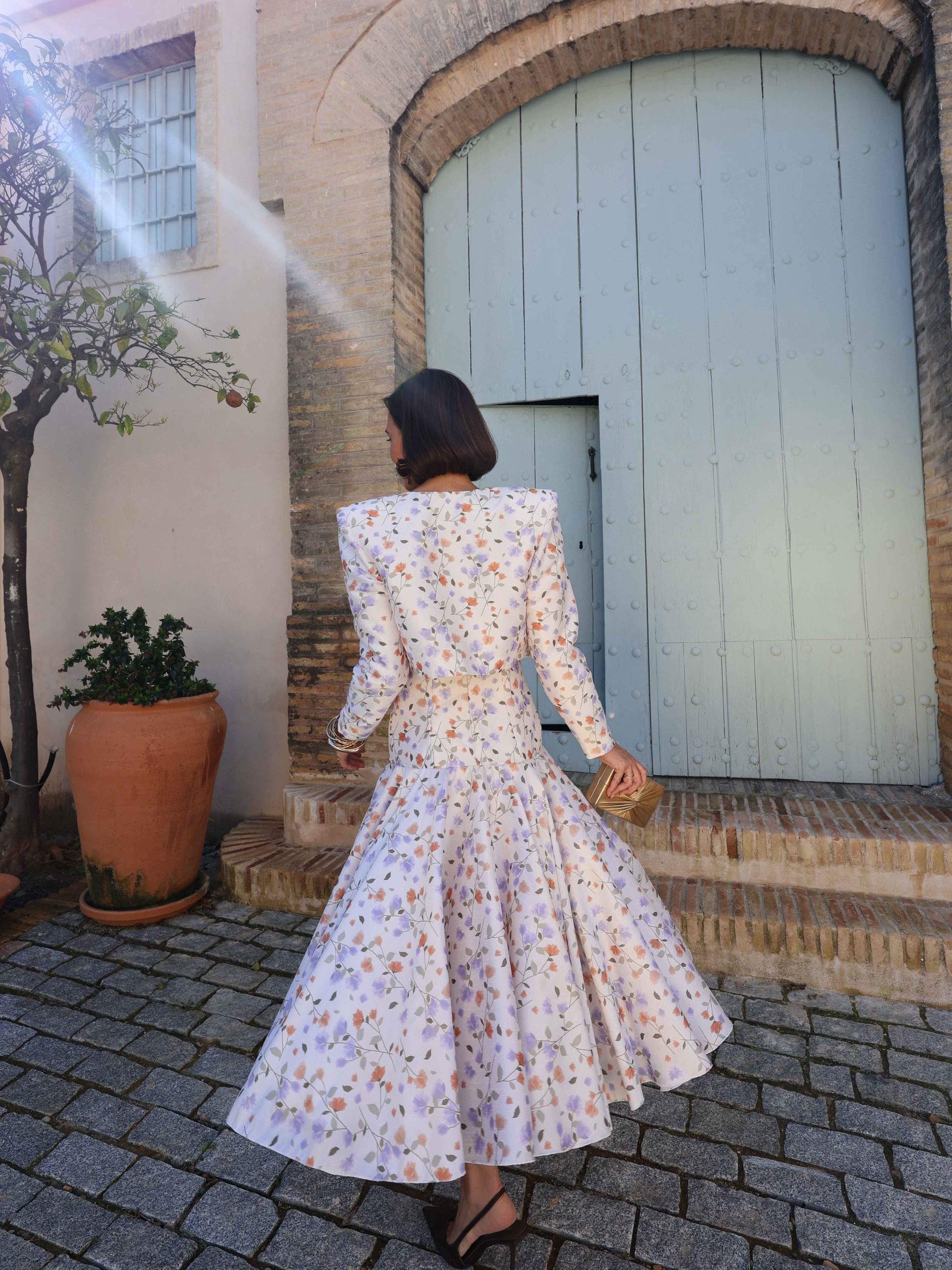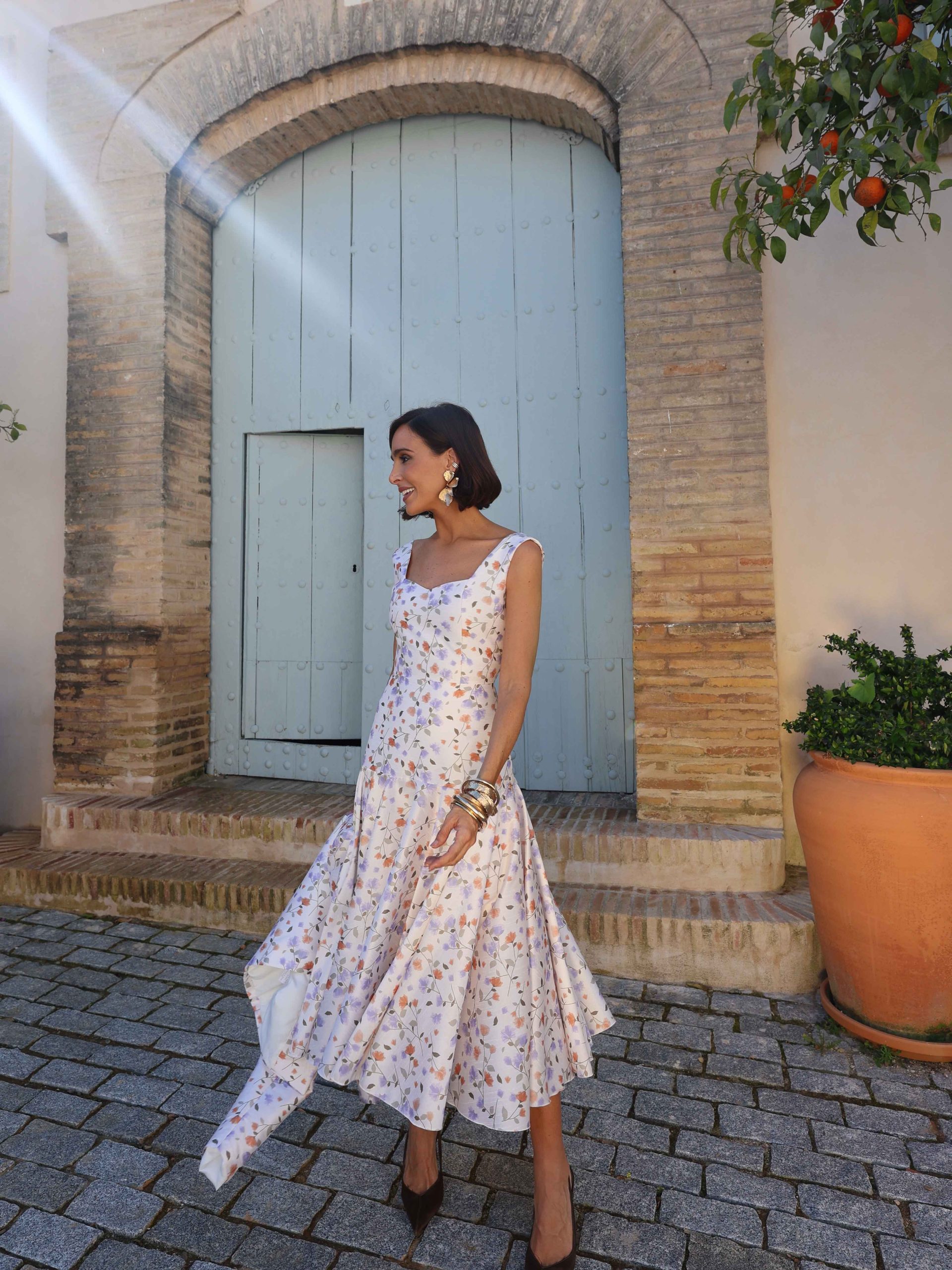 Vestido midi de escote balconet con tirante recto, corte a la cadera y falda de vuelo con largo midi. Confeccionado en tejido de shantung estampado con motivos florales vintage.