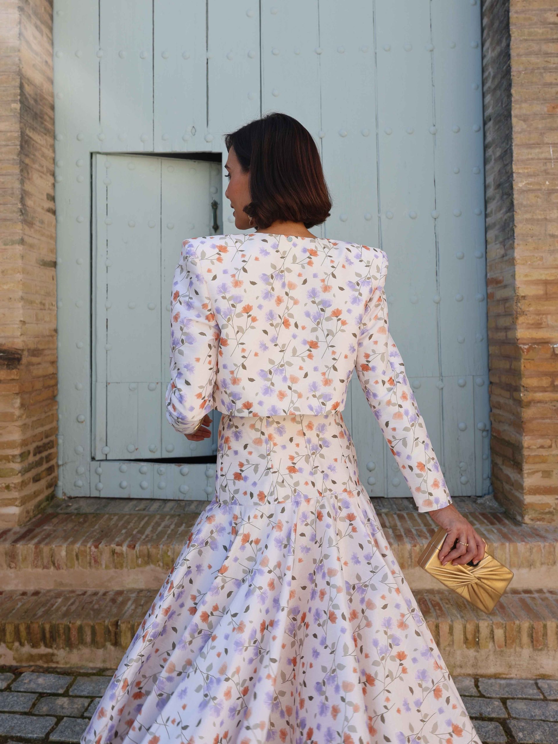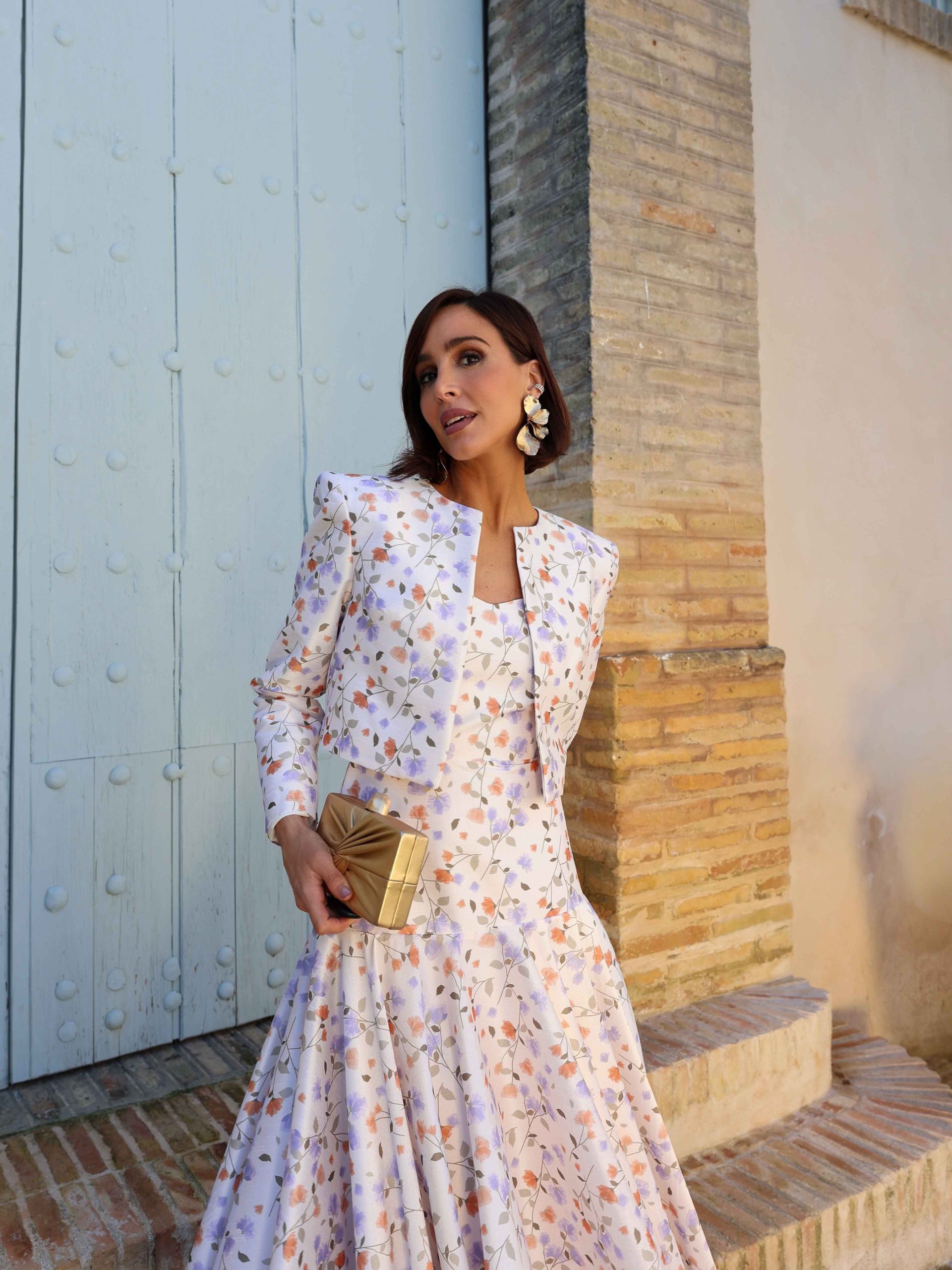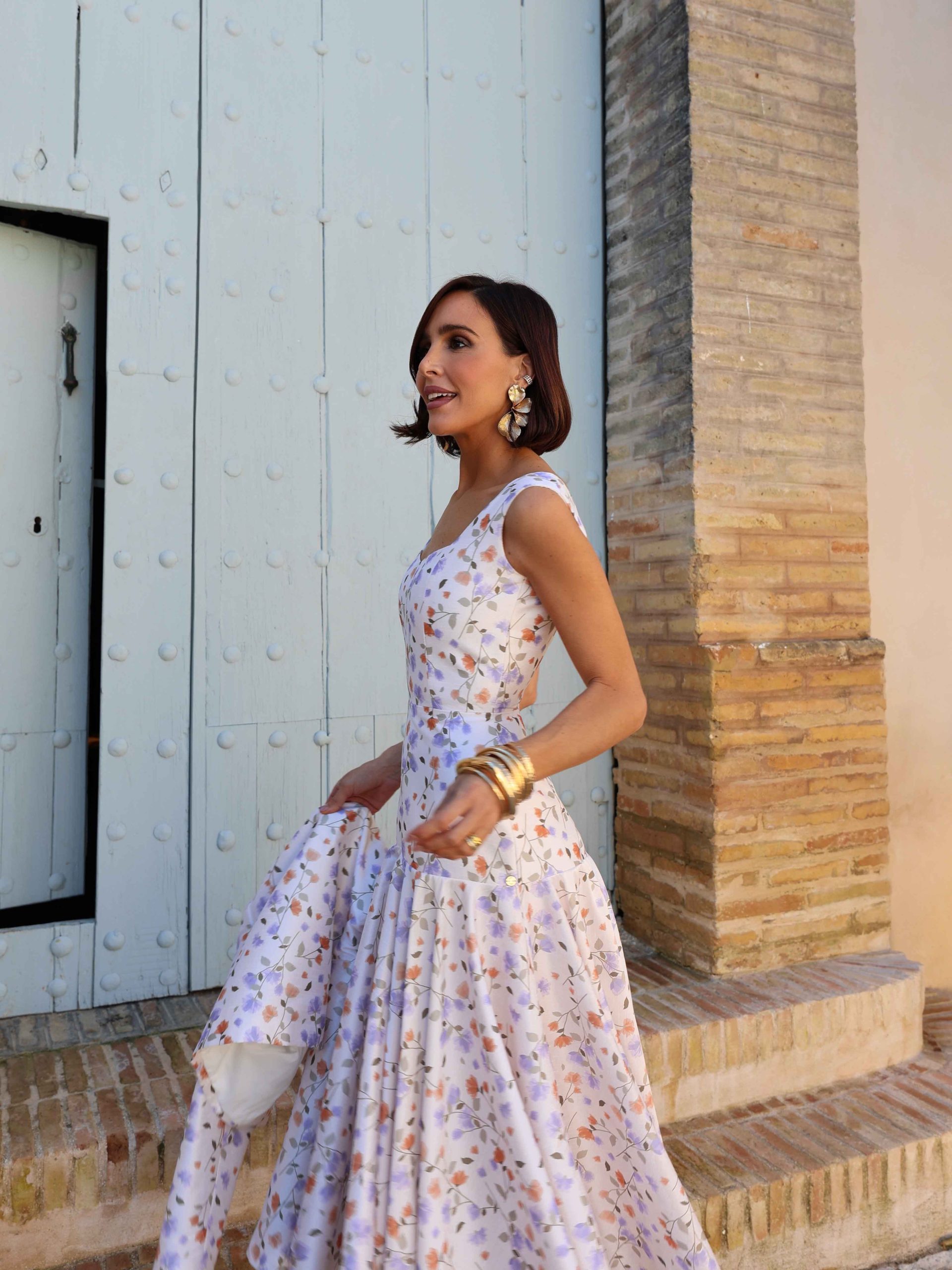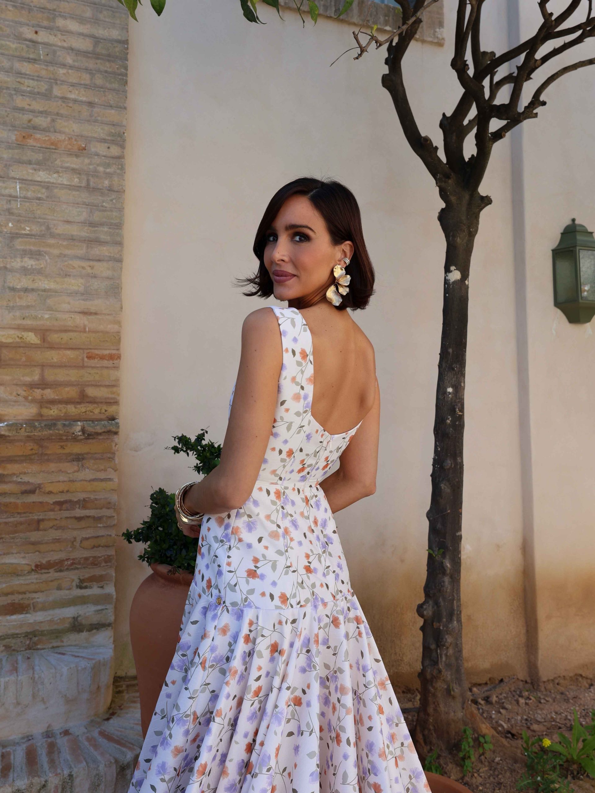 Vestido midi de escote balconet con tirante recto, corte a la cadera y falda de vuelo con largo midi. Confeccionado en tejido de shantung estampado con motivos florales vintage.