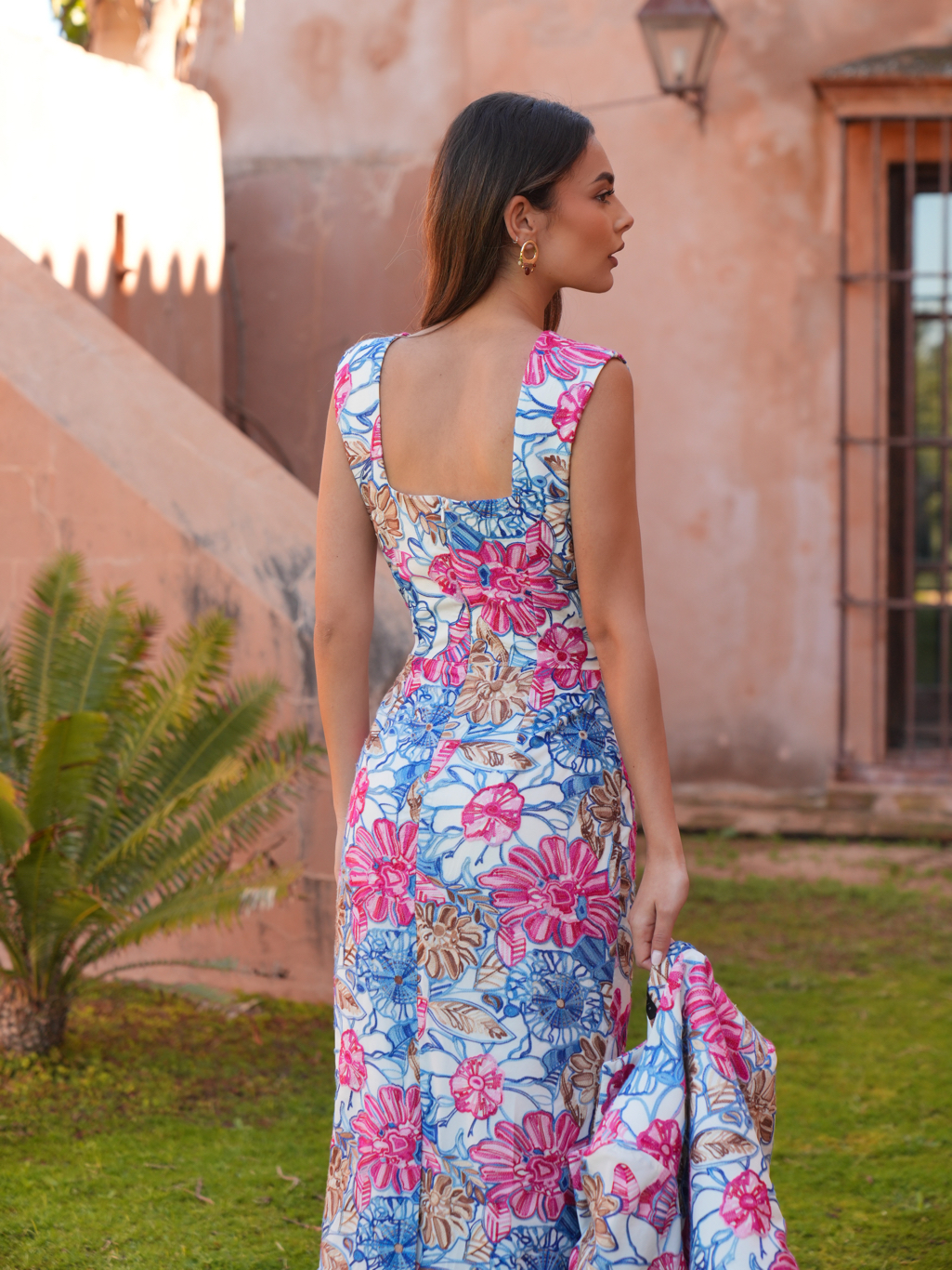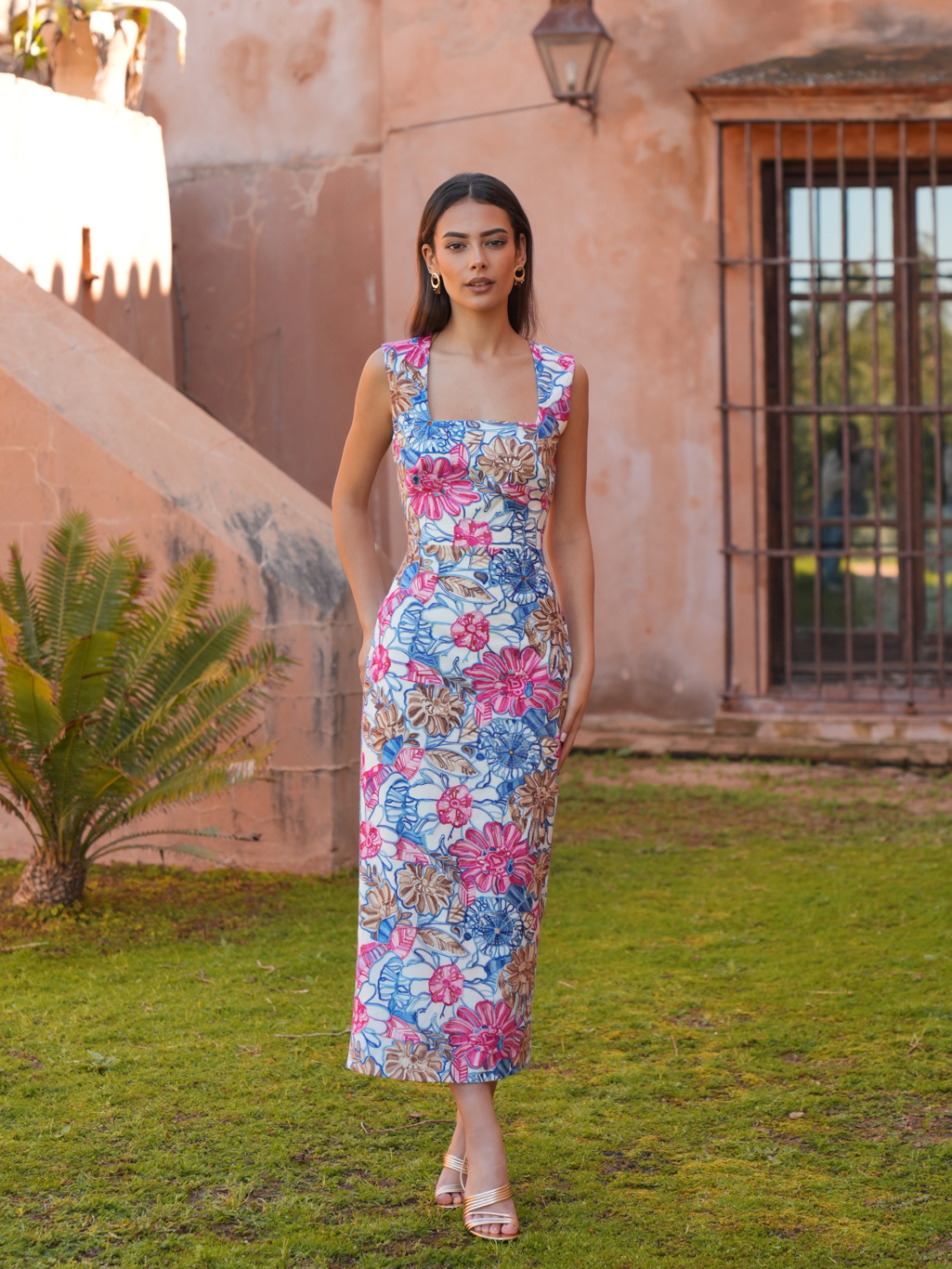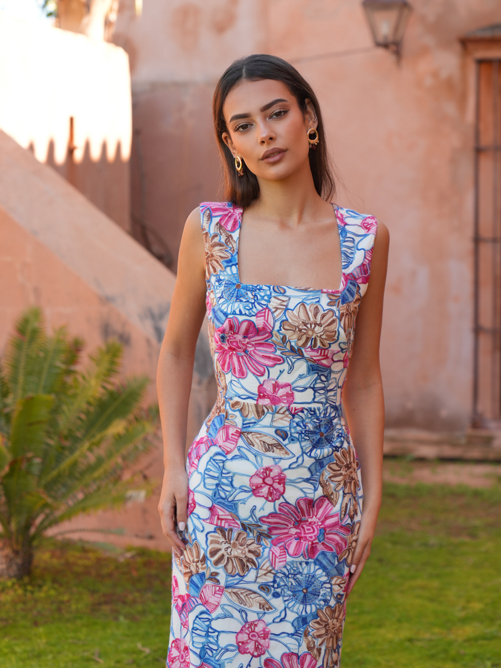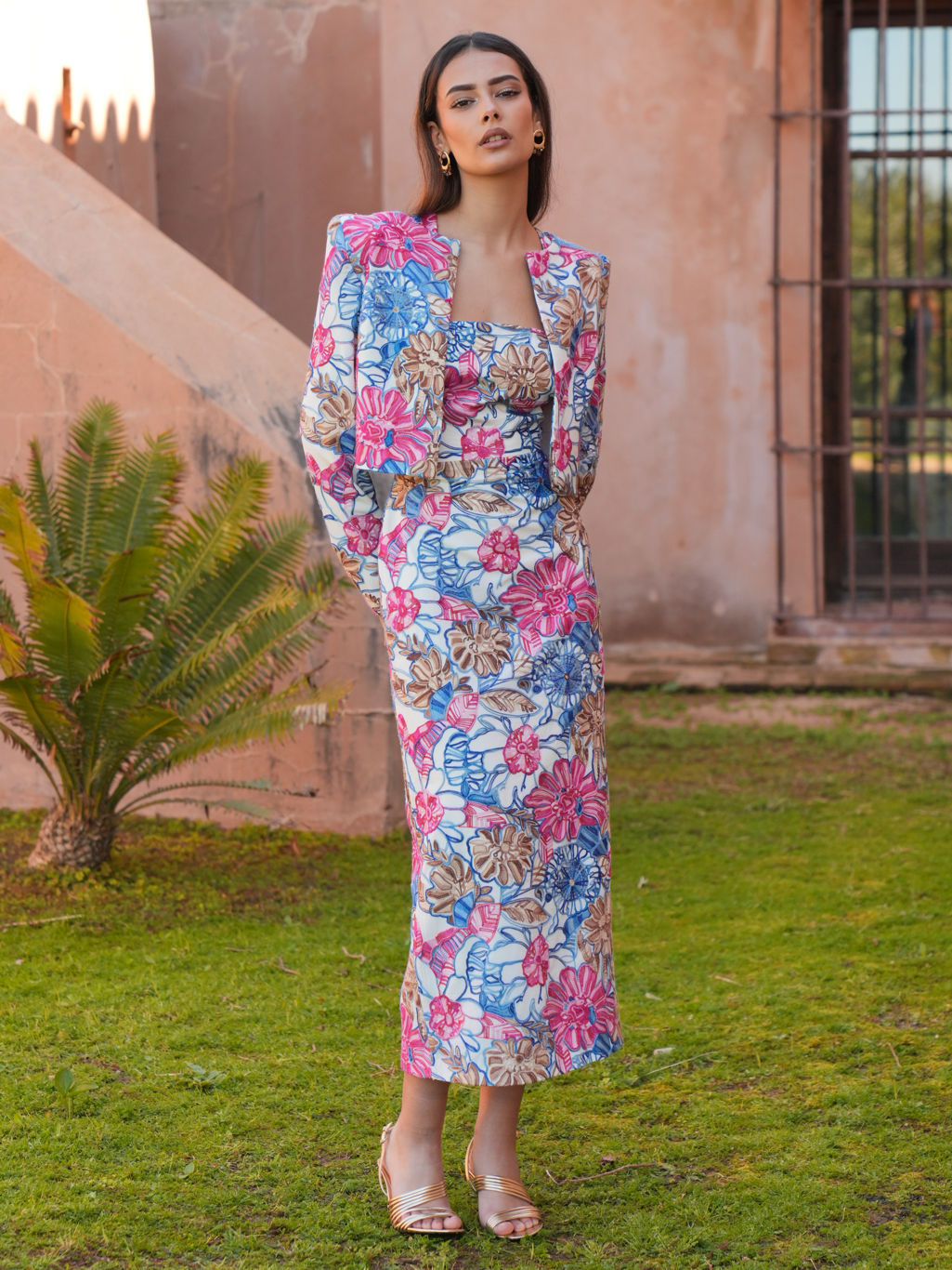 Conjunto dos piezas compuesto por vestido midi entallado con escote cuadrado acabado en abertura trasera y chaqueta torera con hombrera. Confeccionado en tejido bordado y forrado completamente.