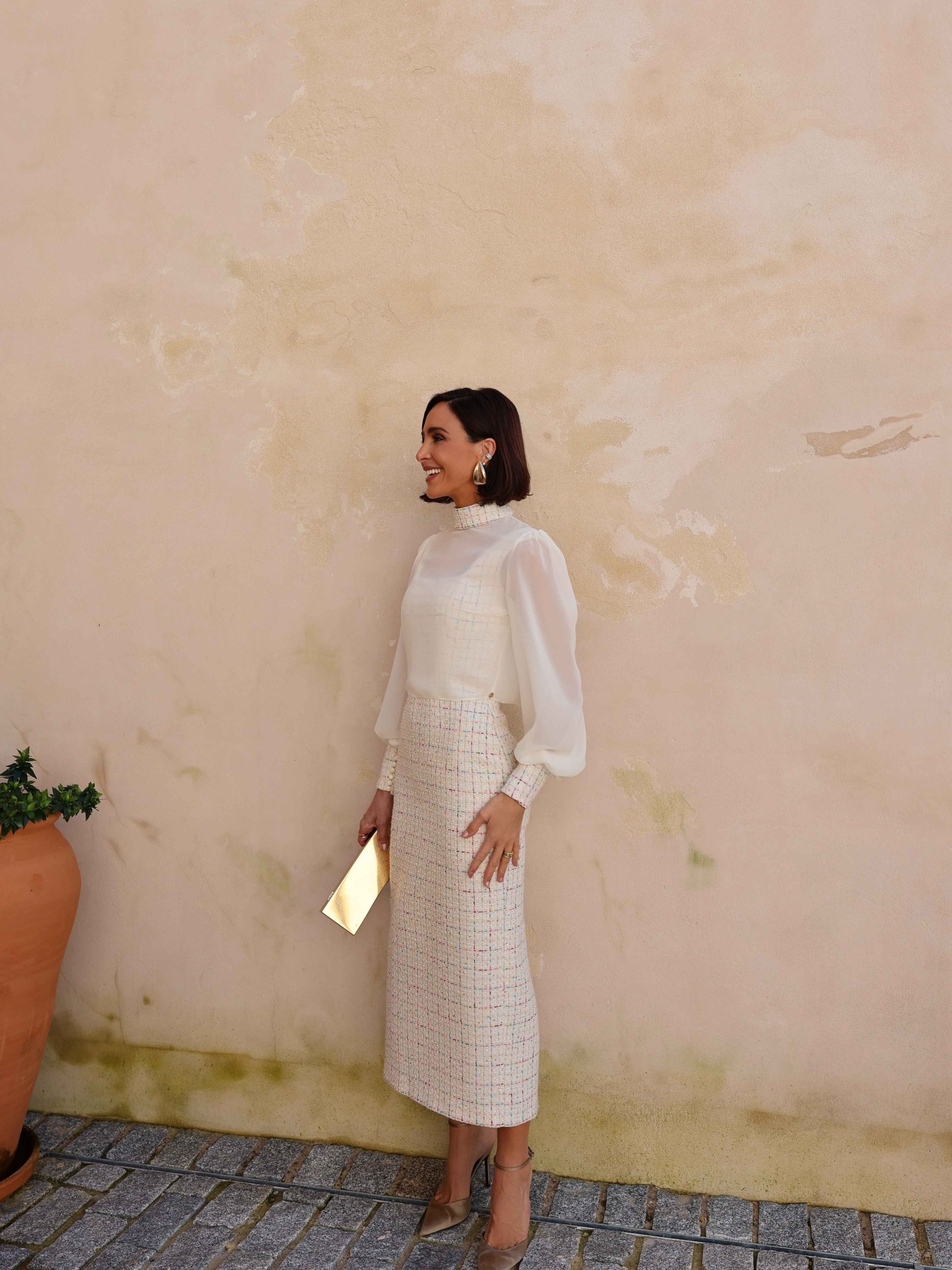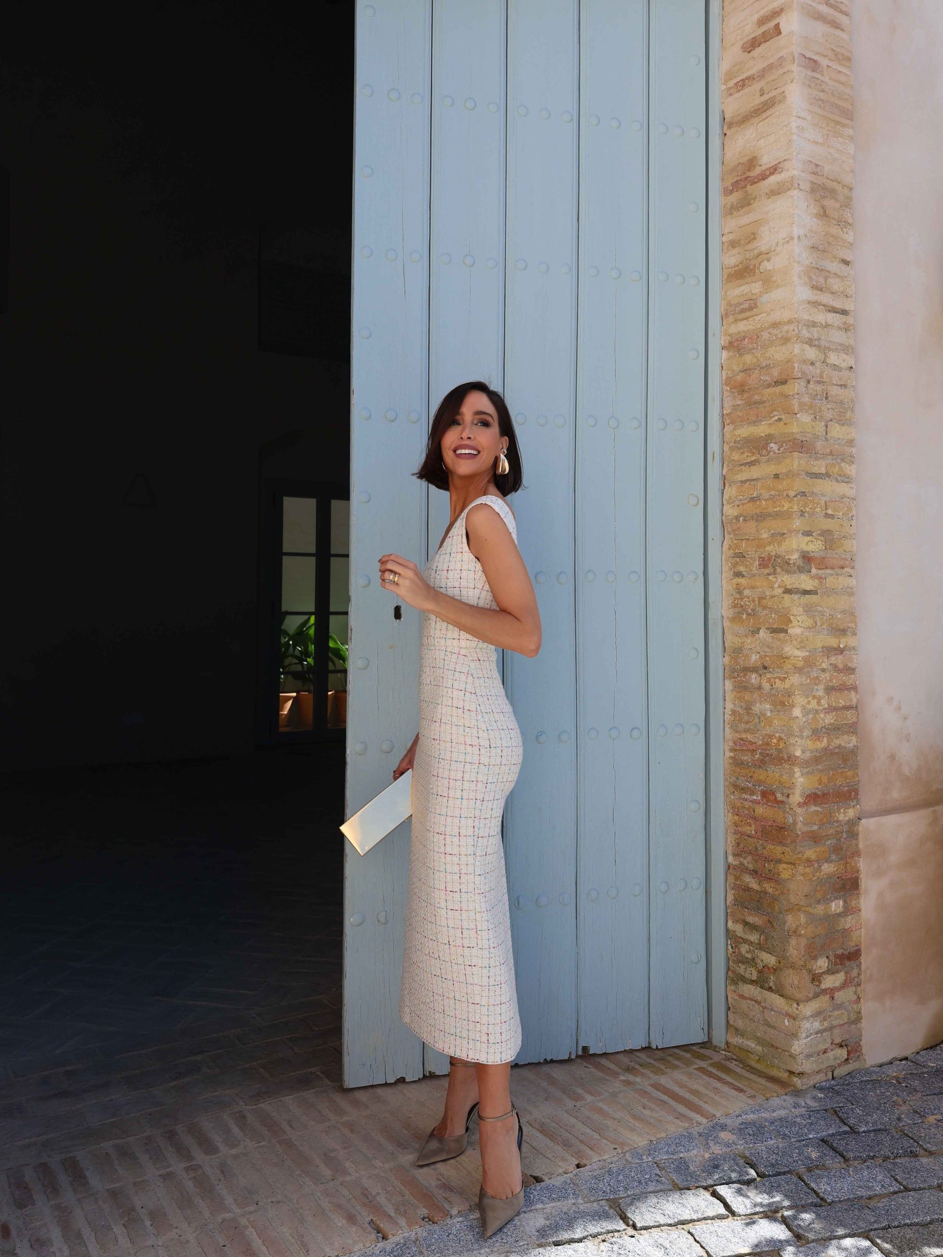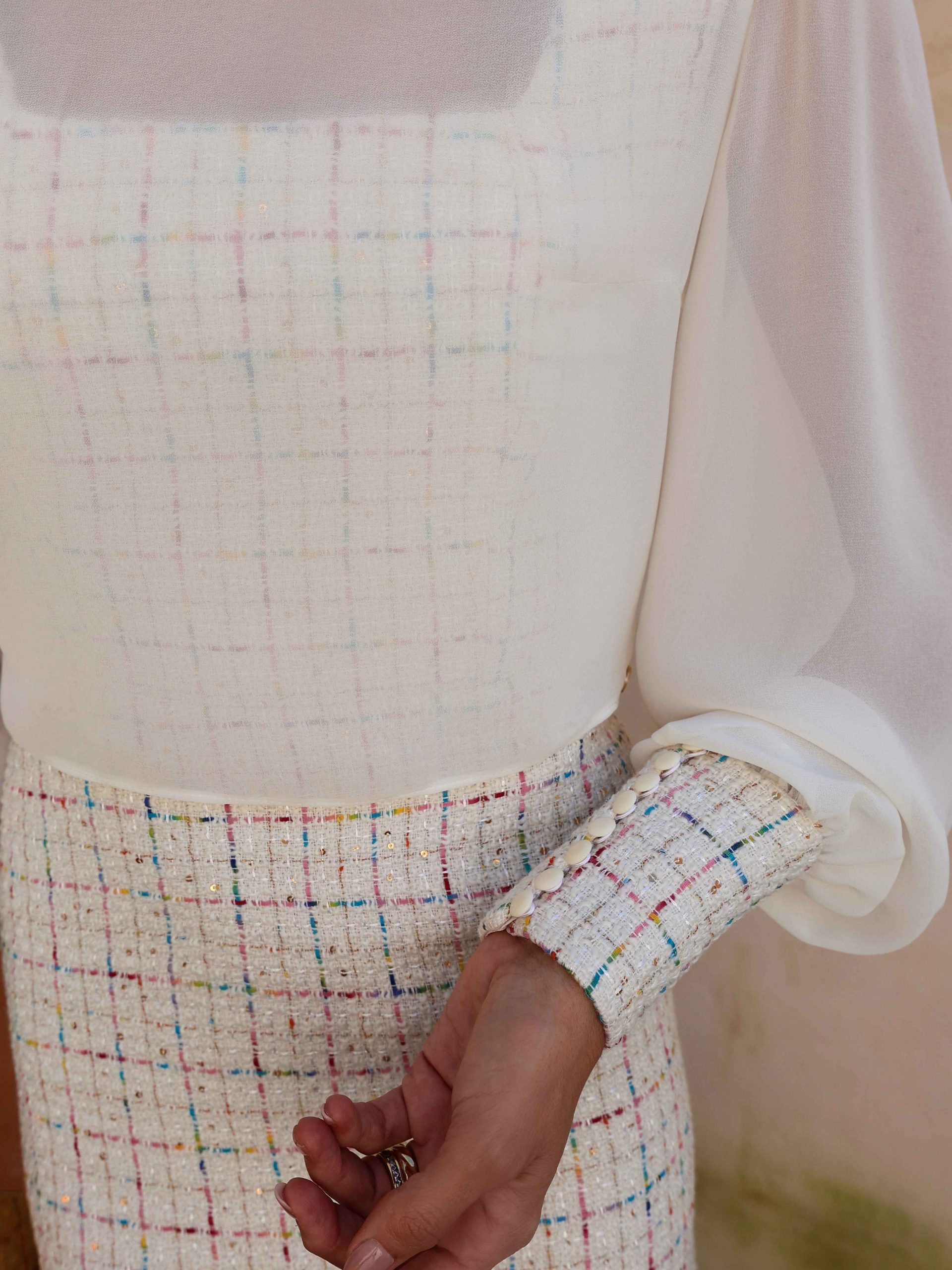 Elegante vestido de escote cuadrado y tirante ancho con cuerpo de gasa y manga larga al tono. Está confeccionado en tejido de tweed color arena y cuadros mixed multicolor con mini pailletes entrelazados.