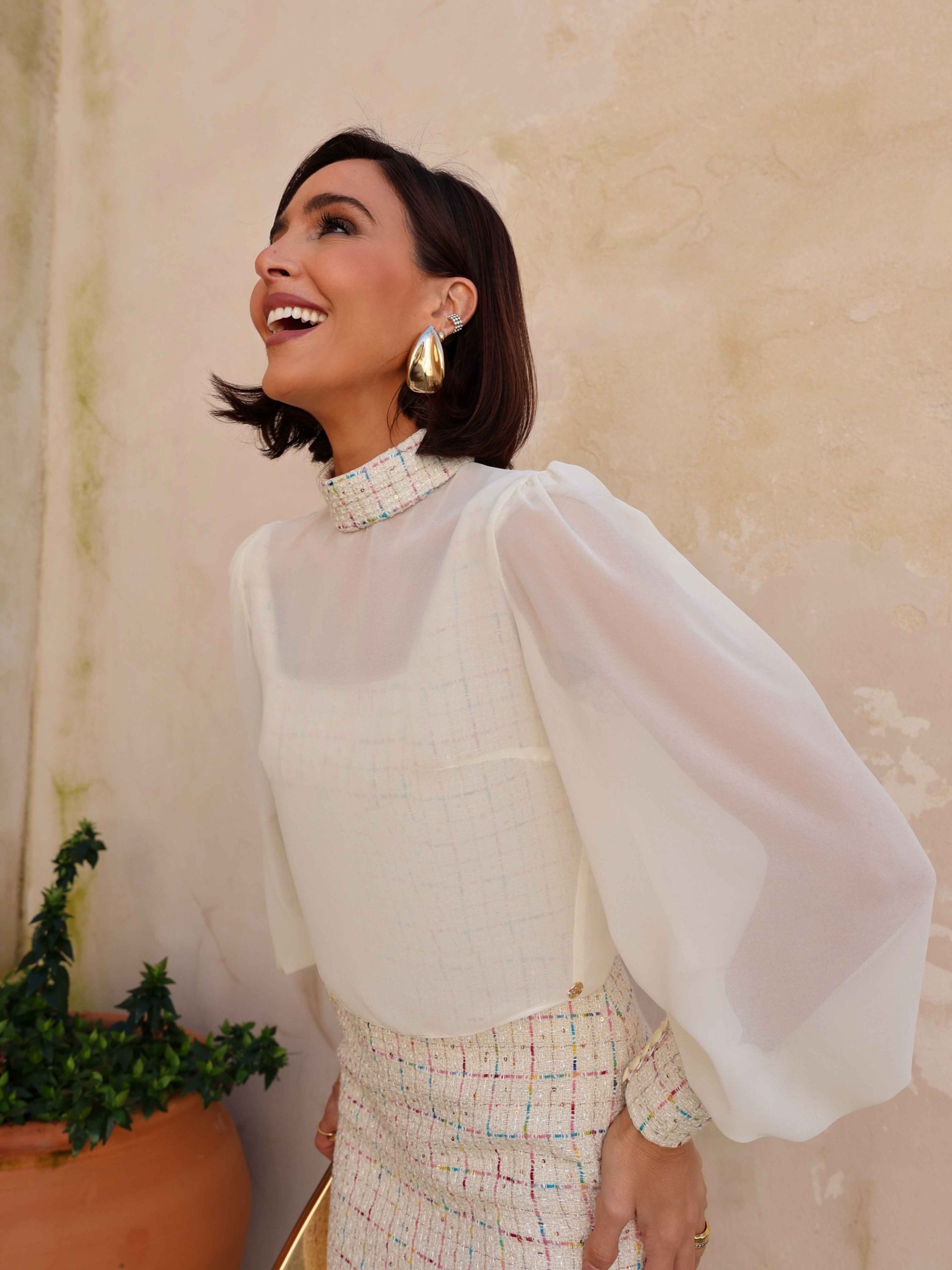 El cuerpo de gasa al tono se combina con puños y cuello de tweed con botonadura forrada.