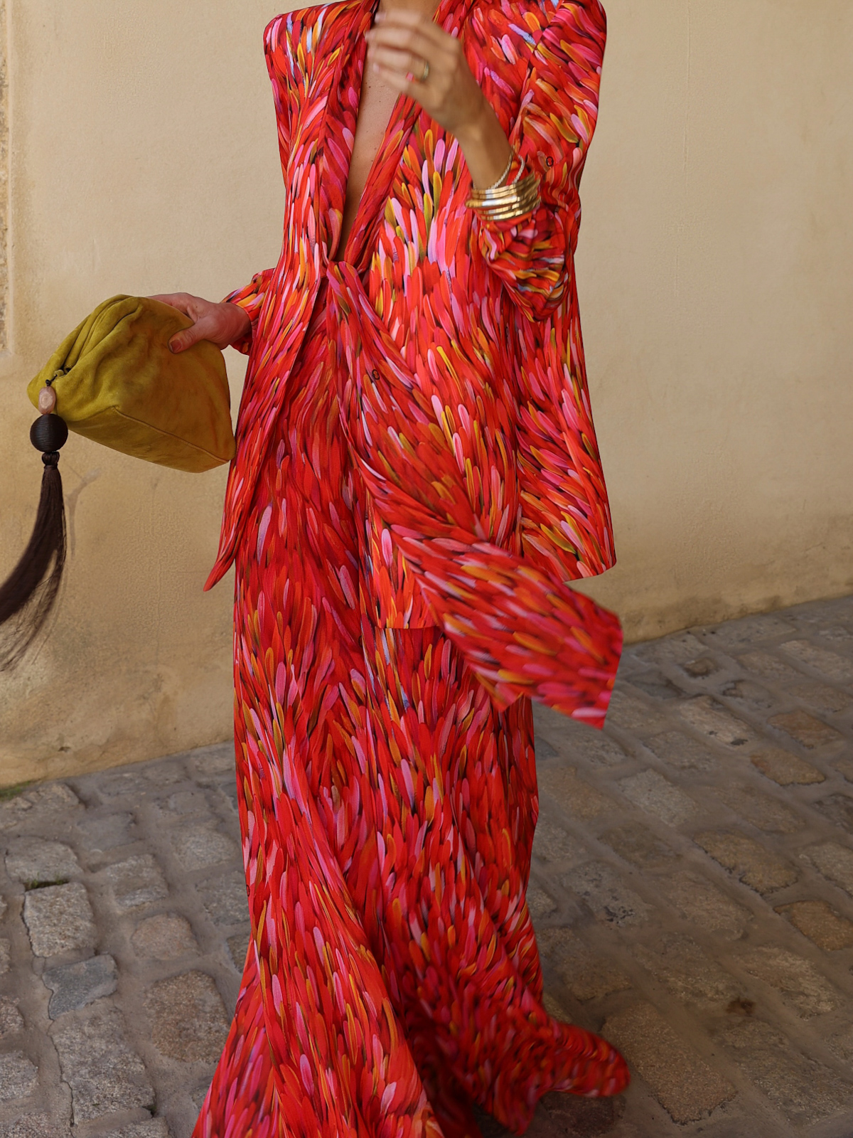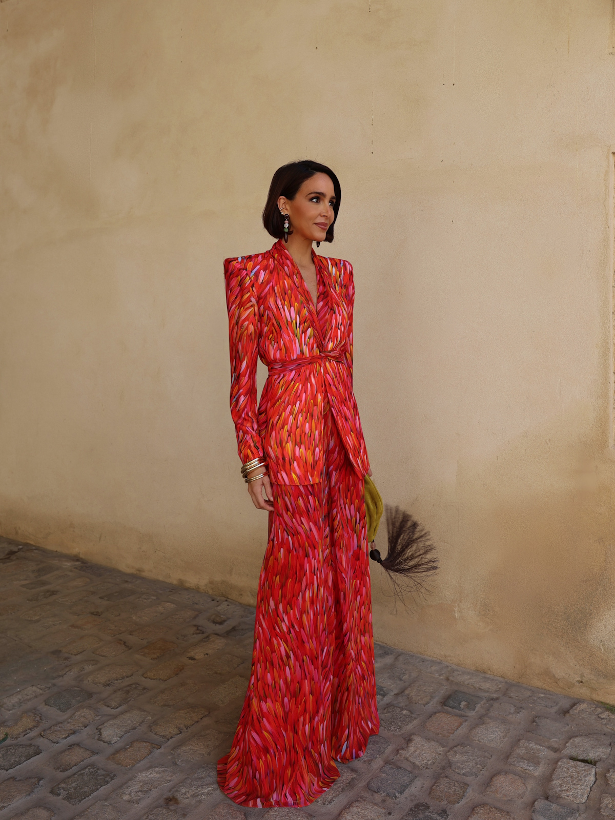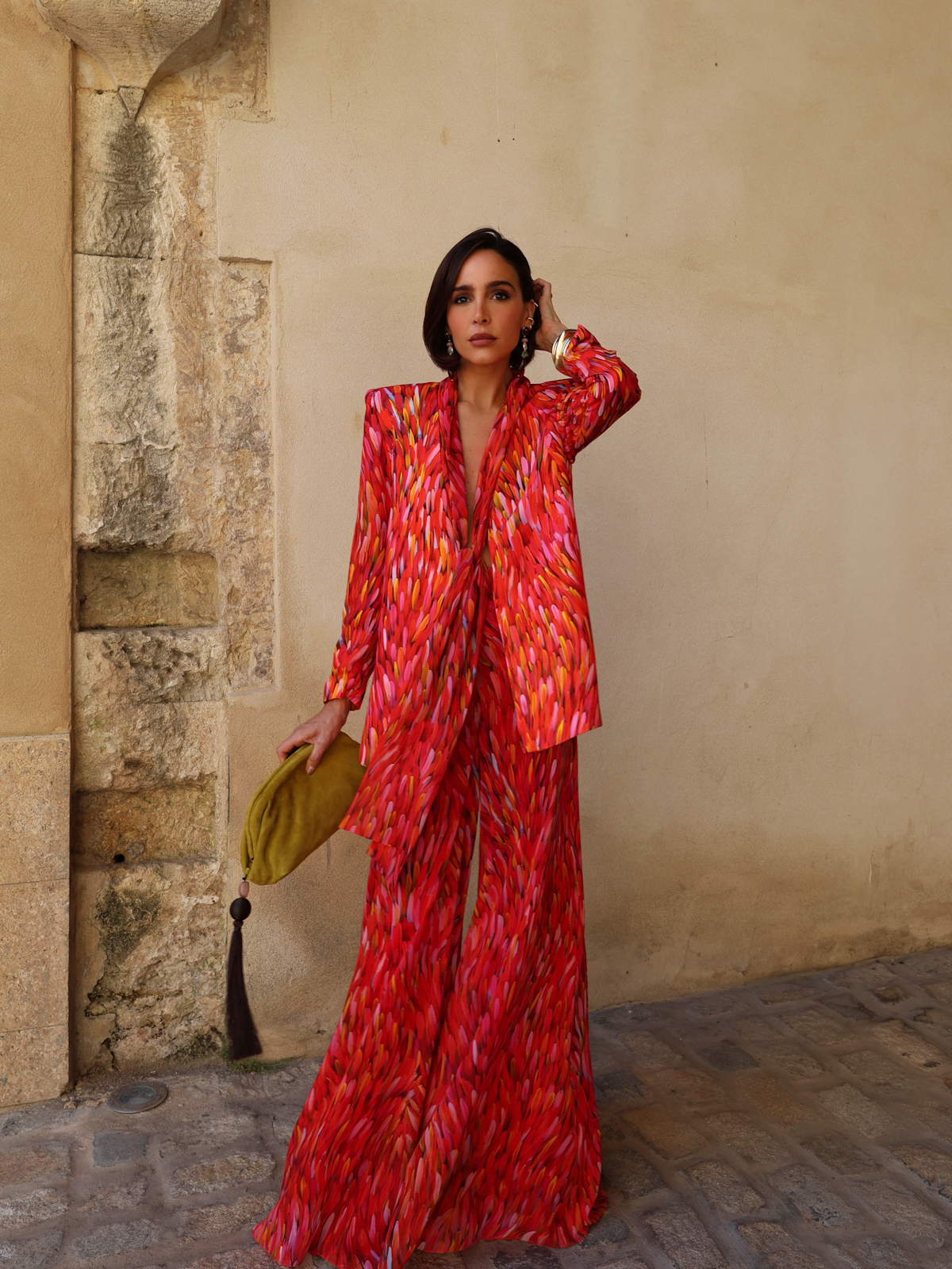 El pantalón es de corte maxi, confeccionado en gasa crepe coordinado con la chaqueta y cinturilla de crepe. Tiene un largo de 115cm y está forrado completamente con tejido de aspecto sedoso, aportando comodidad y ligereza a la prenda.