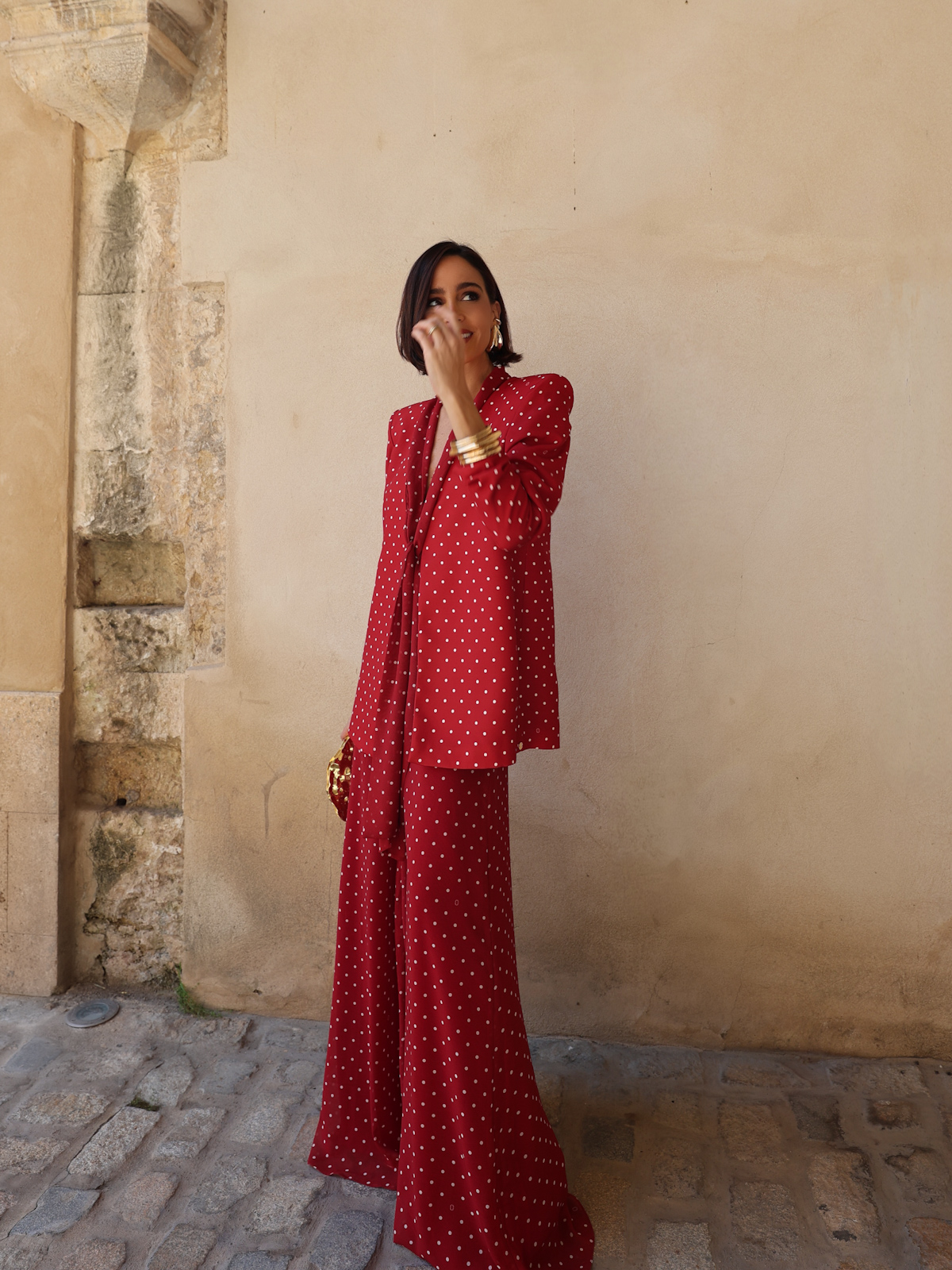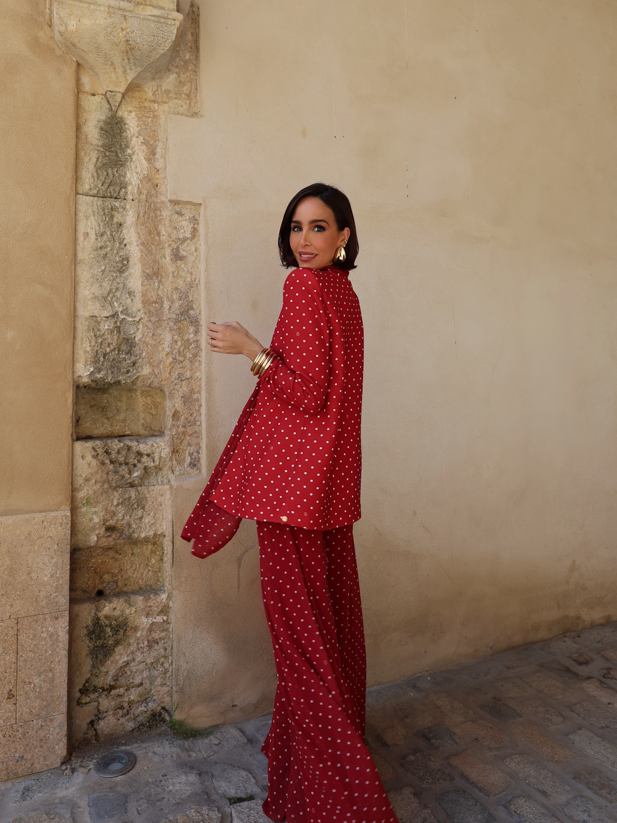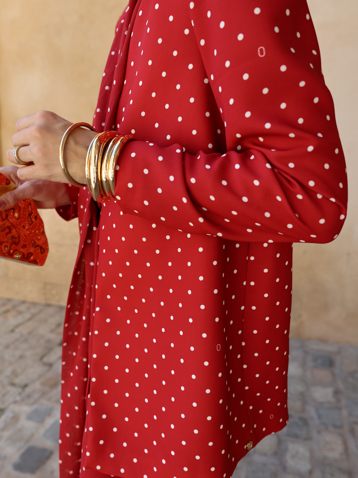 Estampado en lunares con nuestro logotipo insertado, en color Marsala y marfil.