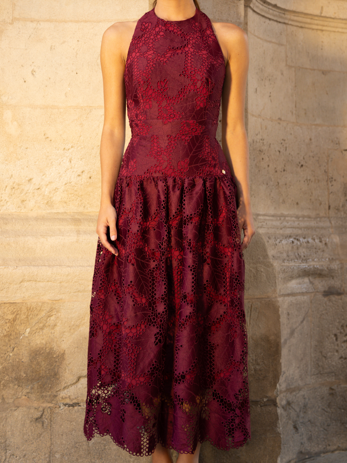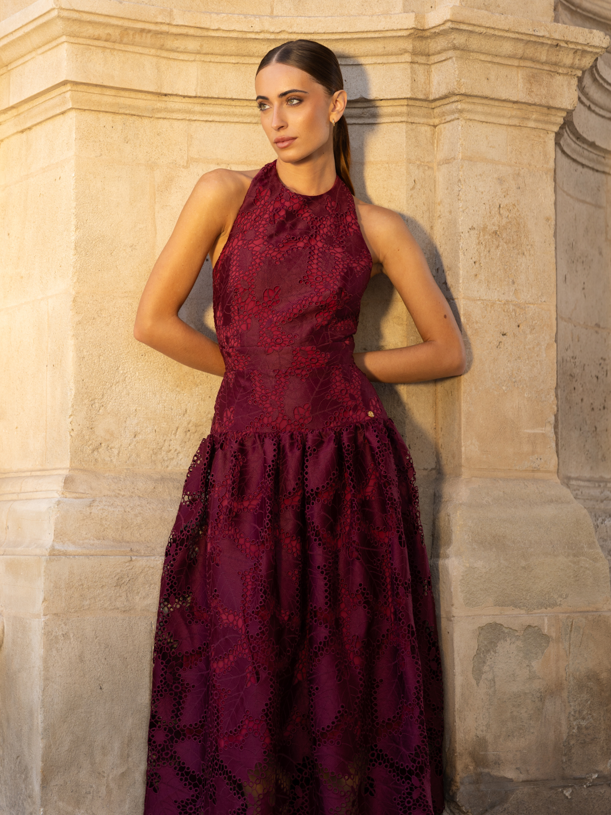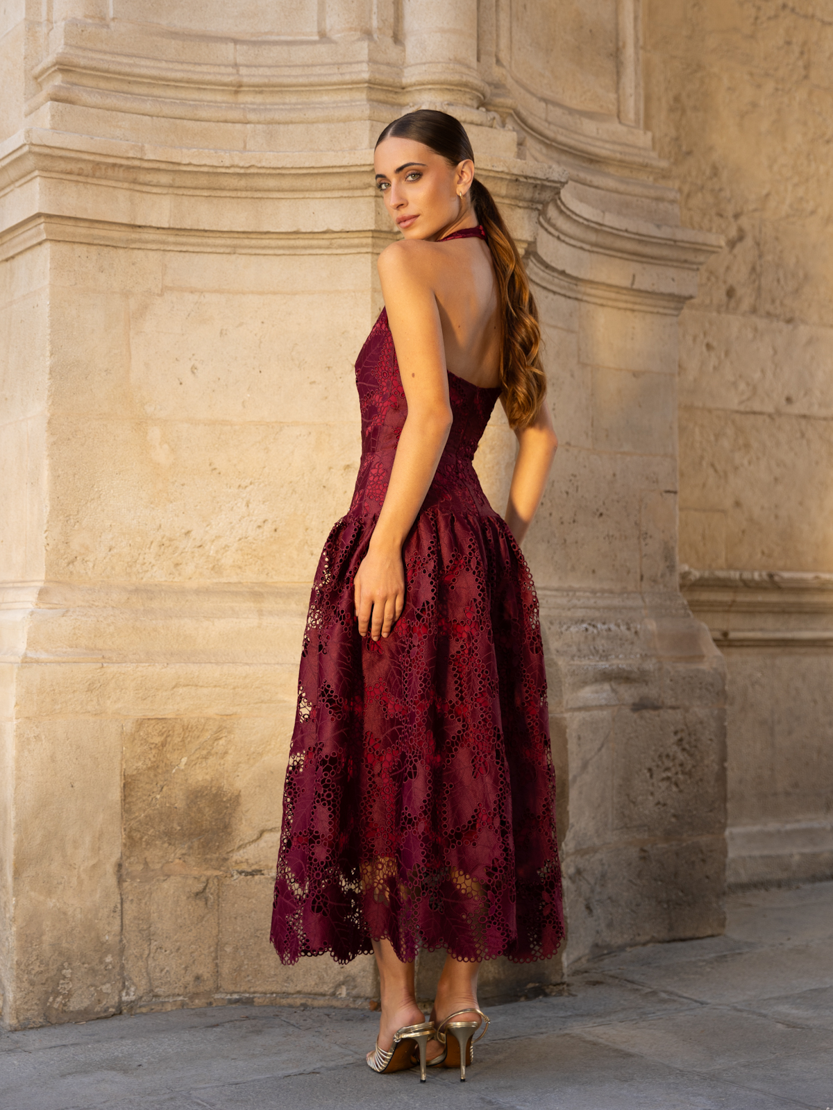 Vestido midi con escote halter confeccionado en este maravilloso tejido de guipur con detalle de hojas. Corte en la cintura con bajada ajustada a la cintura y falda fruncida conservando la blonda en el bajo. Completamente forrado con cremallera trasera y abotonado al cuello.