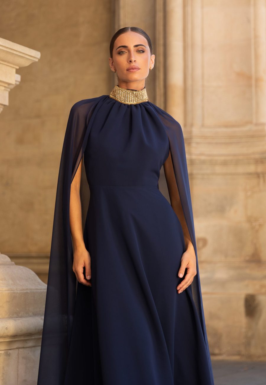 Vestido largo de corte evasé con nesgas, de falso escote halter abotonado al cuello con tirilla y bandas cruzadas al pecho que terminan en tirante recto a la espalda.
