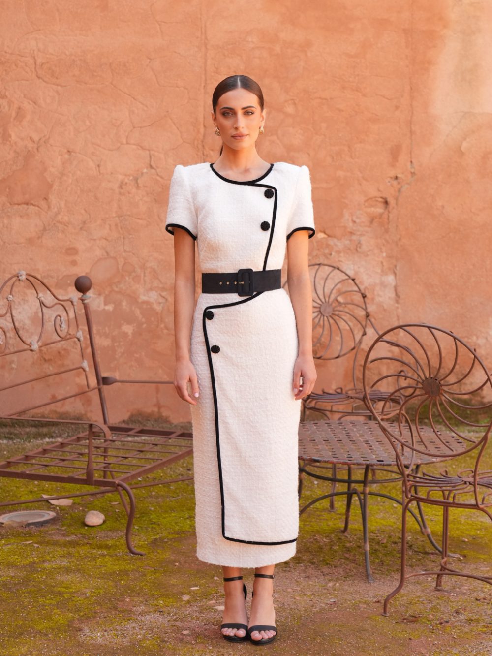 Vestido midi confeccionado en tweed blanco fantasía totalmente forrado terminado en abertura trasera. Escote a la caja, manga corta y sobrefalda viveadas con terciopelo negro y preciosos botones vintage azabache.